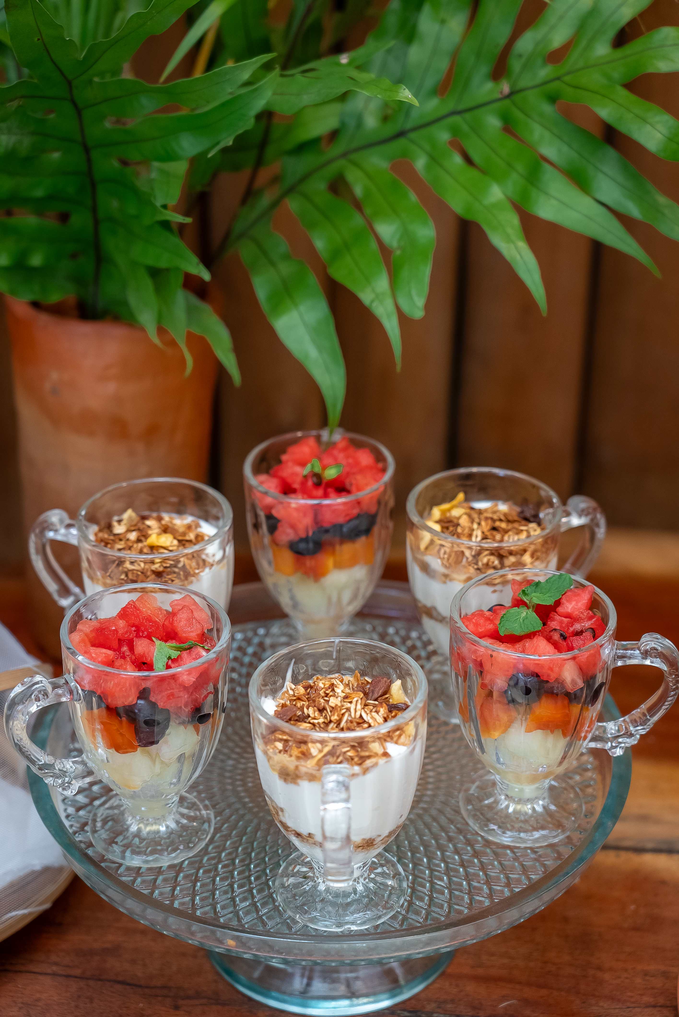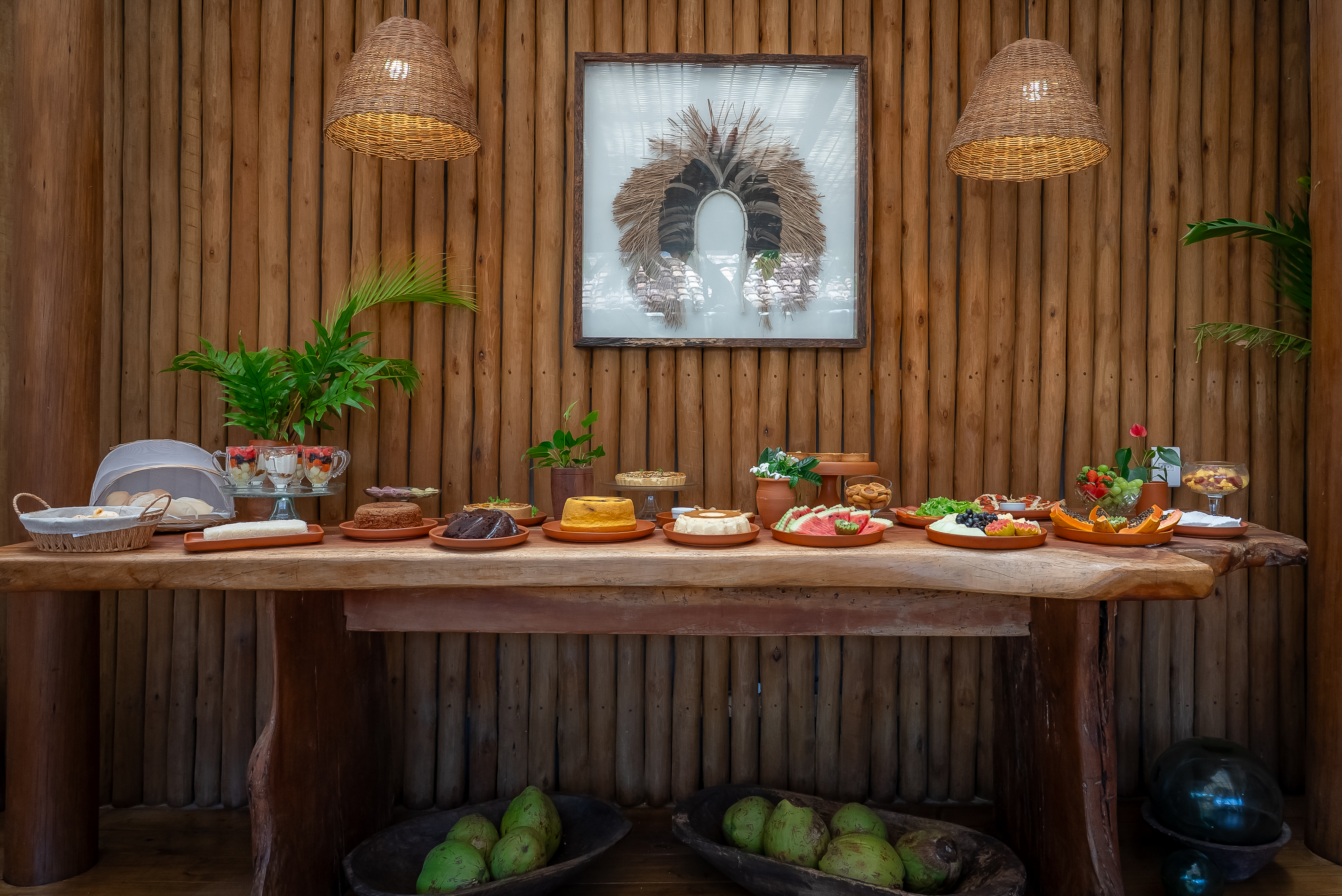 tropicais e bolos caseiros compõem uma mesa colorida, nutritiva e deliciosa. Tudo é preparado com ingredientes frescos, adquiridos de pequenos produtores da região.