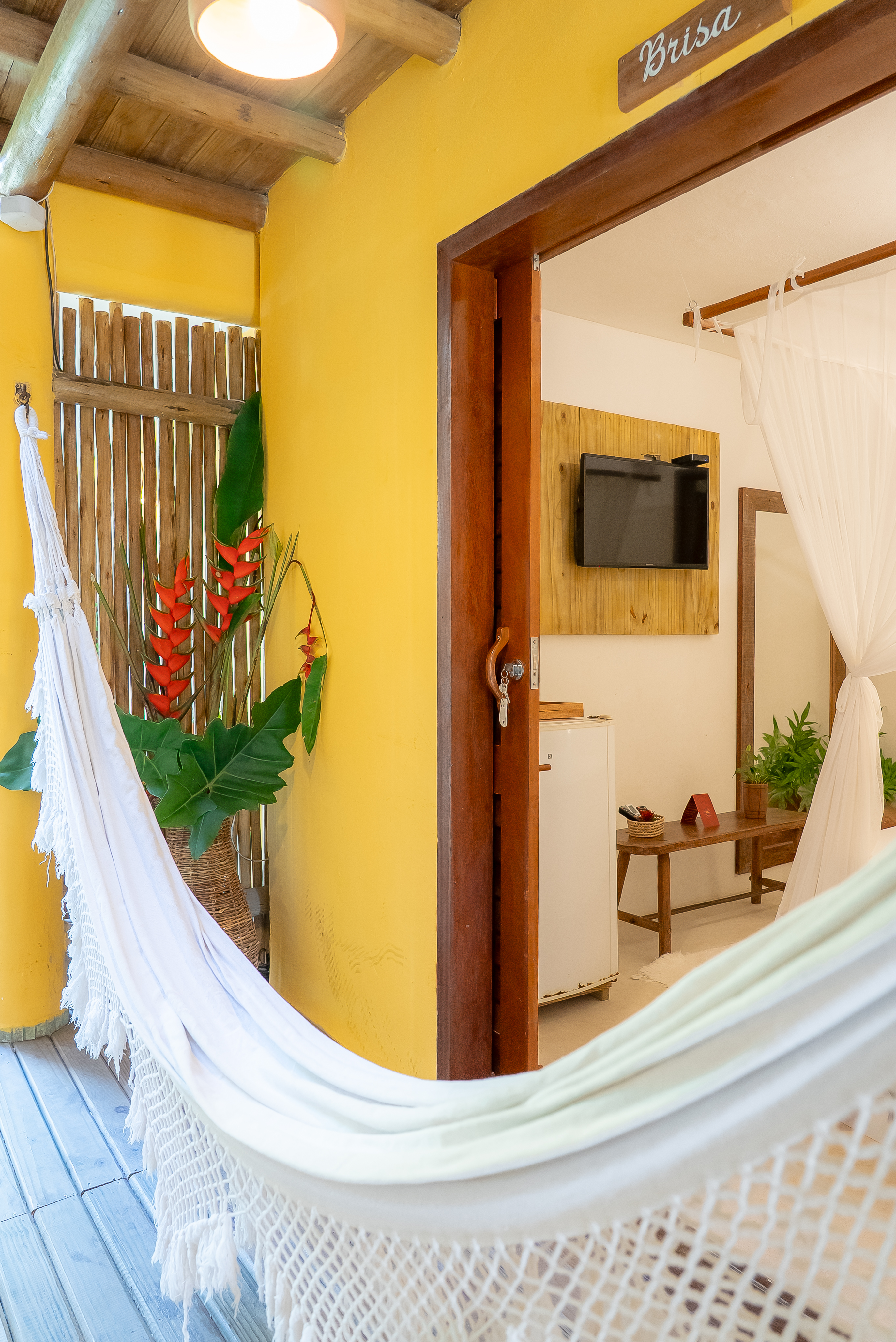 Detalhes & Diferenciais: 1 cama Queen, varanda privativa com rede, decoração inspirada no frescor das tardes de Trancoso e em artesanato local, ar-condicionado, frigobar, enxoval completo e roupas de cama macias.